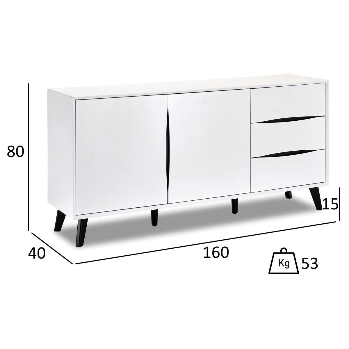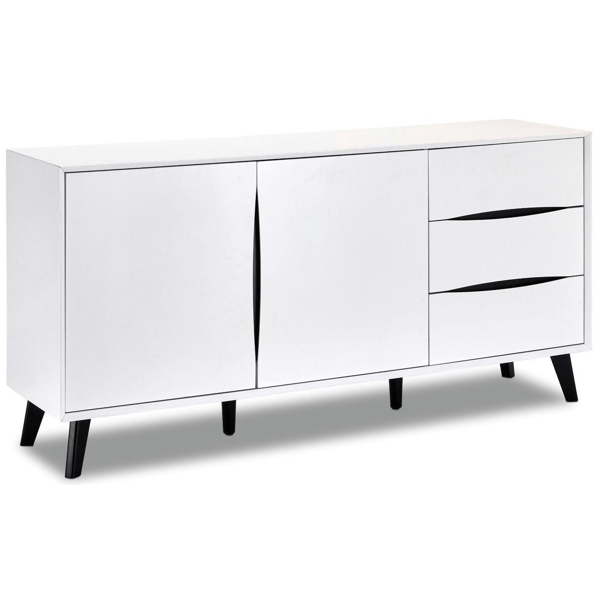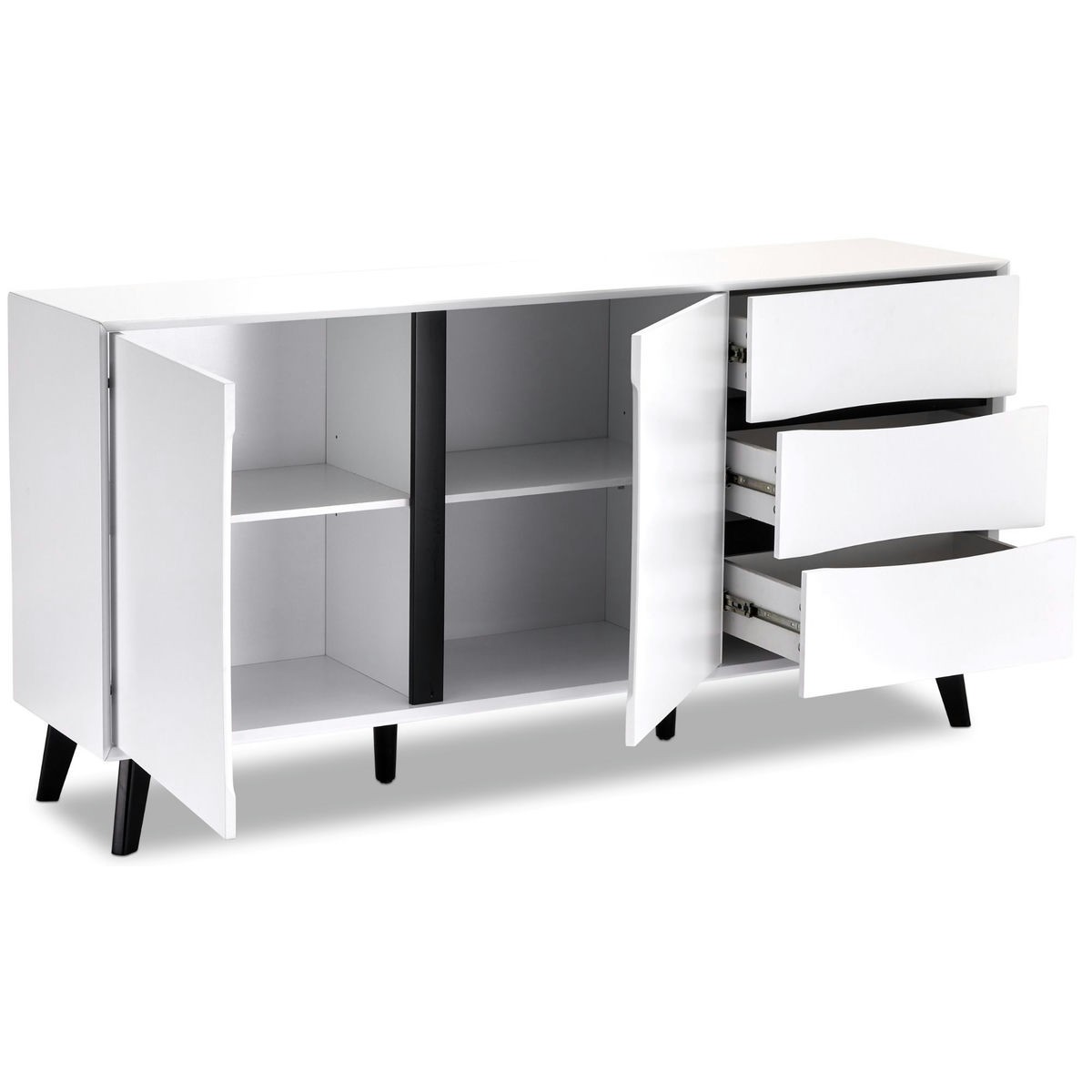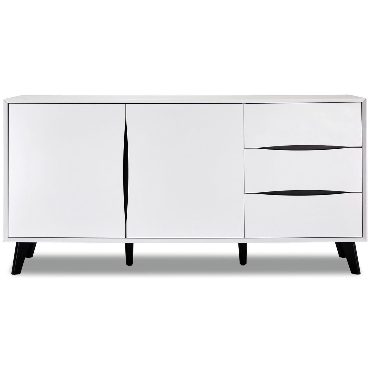 Lyon-sideboard er lavet af en kraftig MDF-ramme og har en elegant melaminoverflade i en elegant hvid/sort farve. Dørene og fronterne er ligeledes udført i MDF, og et låsesystem med udfræsede greb er standard. Denne skænk har 2 låger, 3 skuffer og 2 hylder, der giver masser af opbevaringsplads. Benene er lavet af sort træ og har et dekorativt bøgetræ design.