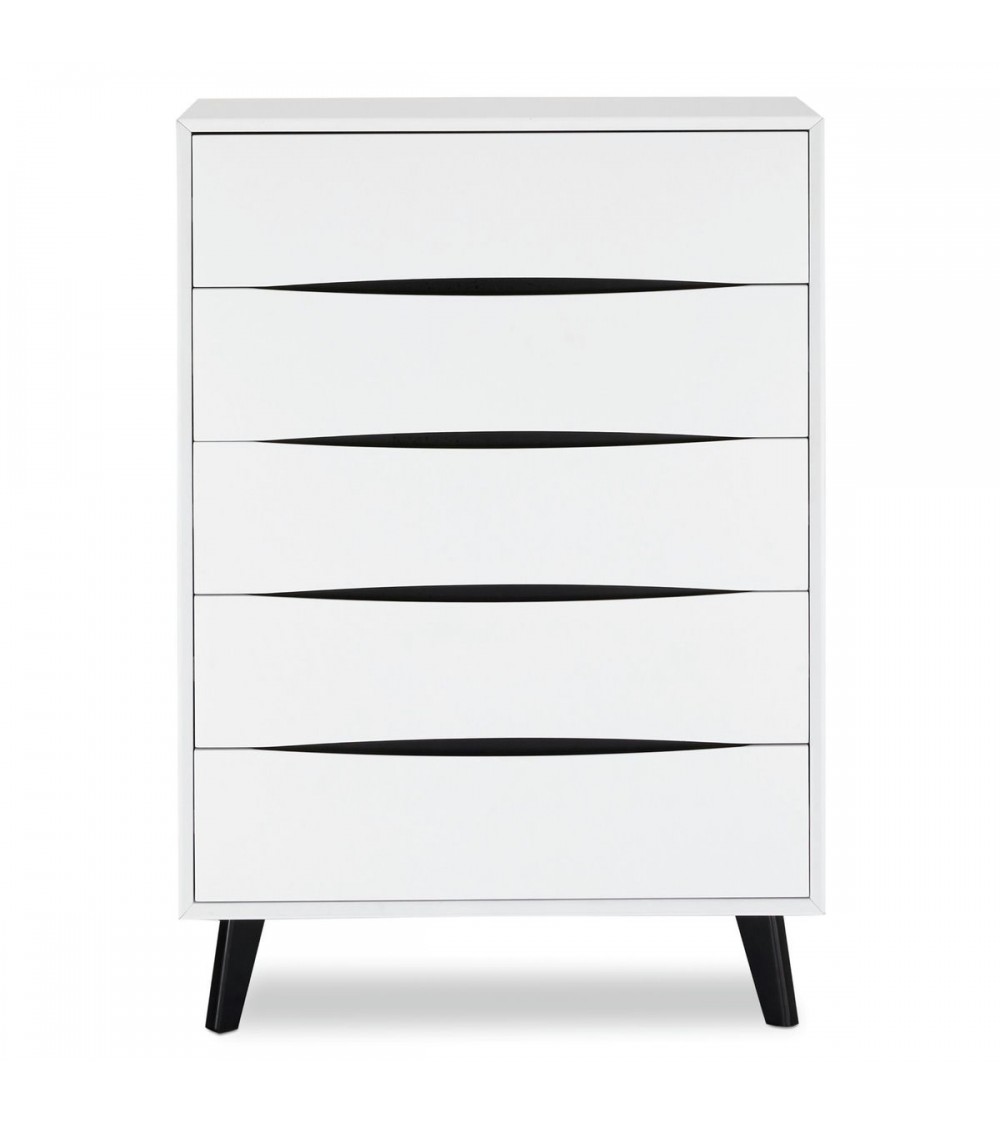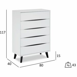 Lyon kommoden er lavet af en MDF ramme og har en melamin overflade. Den er hvid/sort i farven og lågerne/fronterne er ligeledes MDF. Låsesystemet er standard og håndtagene er fræset. Denne kommode har 5 skuffer og ingen låger eller hylder. Benene er sorte og træ, dekoration/træbøg.