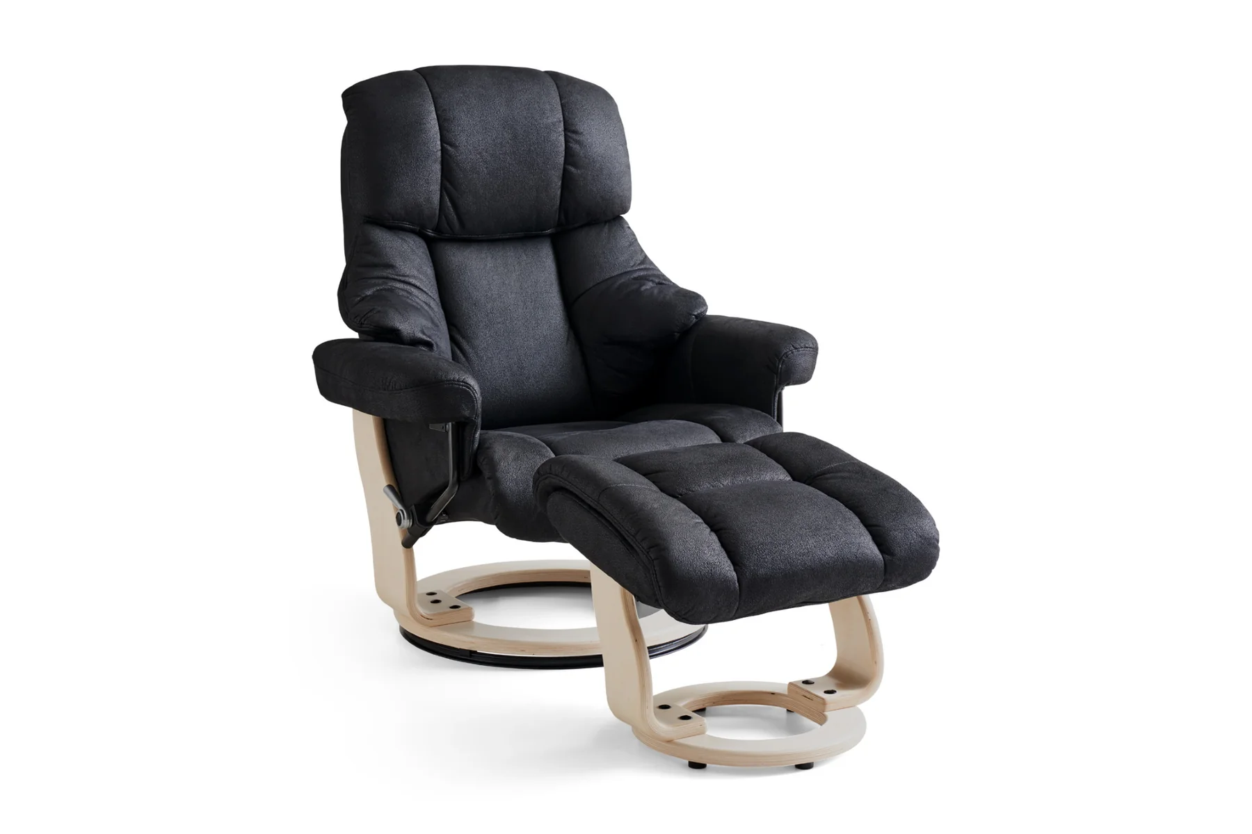 Recliner stol Crown, sort micro fiber. Stel i natur træ, incl. skammel. Ringsokkel